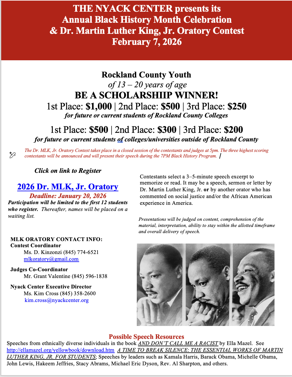 Nyack Center will host its annual Black History Month Celebration on Saturday, February 7, 2026. The annual Dr. Martin Luther King, Jr. Oratory Contest, which has been part of Nyack Center’s Black History Month Celebration for the past eleven years, will take place in two phases: Phase 1 –Saturday, February 7th at 4:30pm: contestants will present his/her speech to a panel of judges who will rate and determine the finalists with the top 3 scores. Phase 2 –Later the same evening, Saturday, February 7th at 7 pm, during the annual Black History Month program. All contestants will be introduced, given certificates of participation, and at that time, the 3 finalists will be announced. The finalists will deliver their speech during the program and judges will rate each to determine the 1st, 2nd, and 3rd place winners who will be announced at the end of the program.